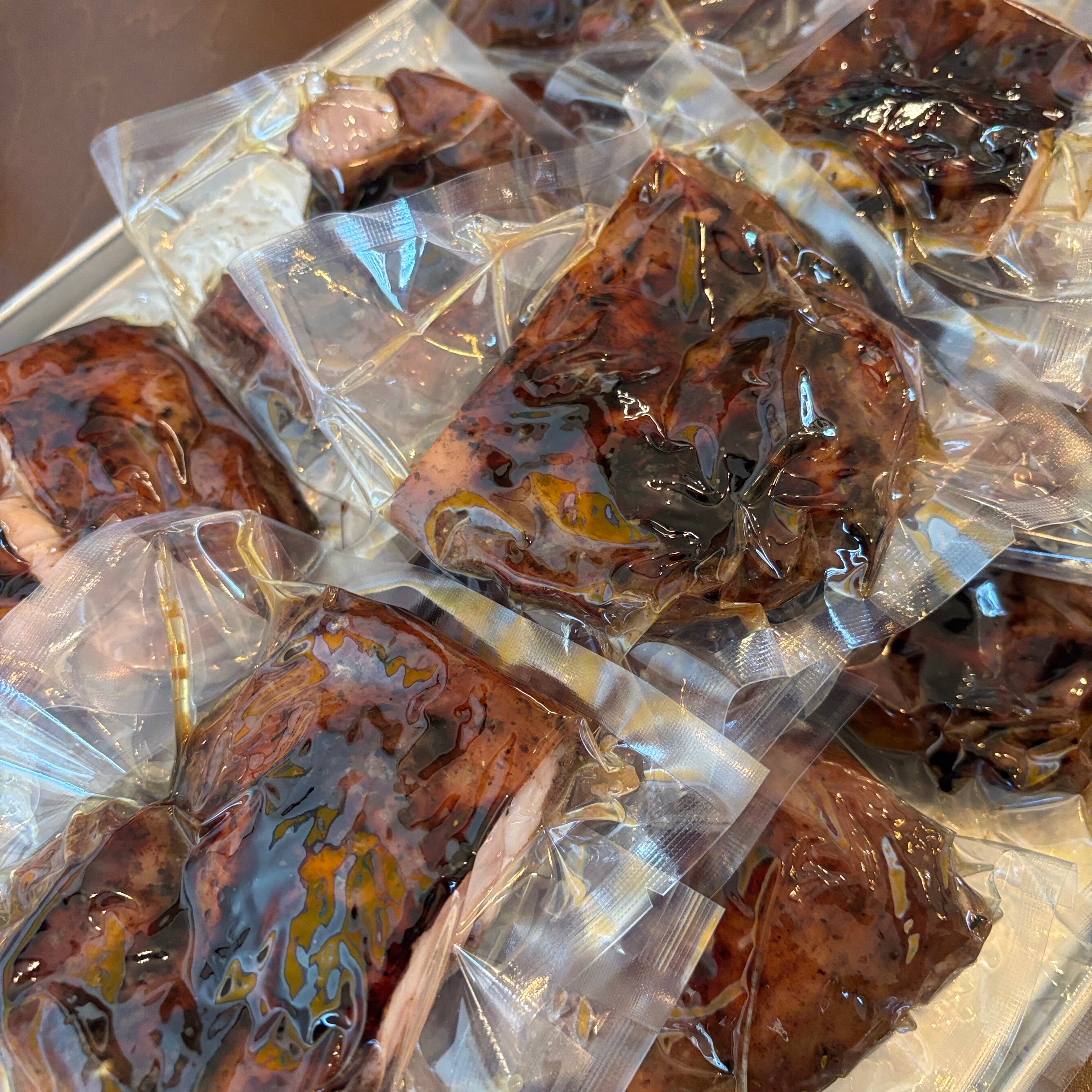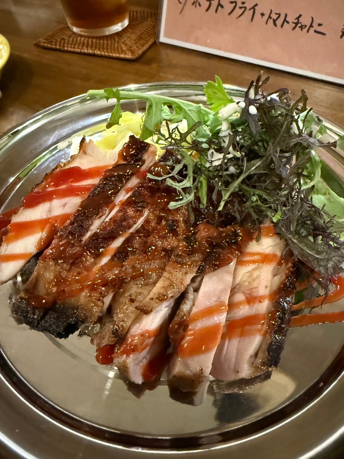 カレー屋ならではのスパイス、ハーブに漬け込んで、炭火で燻し焼きにした料理です。
